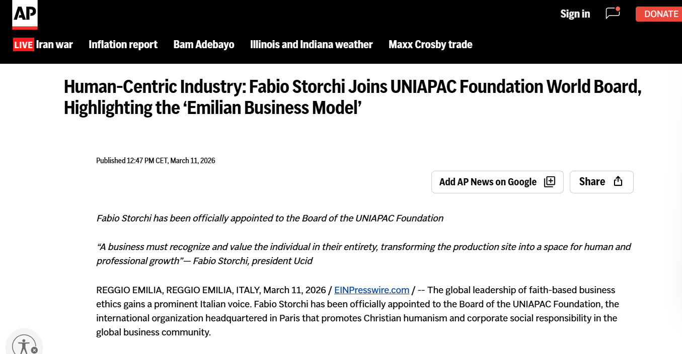 (Ti Lancio dall’Emilia Romagna e dagli Stati Uniti) Reggio Emilia – New York 11 marzo 2026 – Quando la notizia di un’eccellenza locale incontra l’autorevolezza della stampa globale, l’impatto è dirompente. La prestigiosa agenzia di stampa americana Associated Press (AP) ha rilanciato a livello internazionale il dispaccio relativo alla nomina di Fabio Storchi nel Board mondiale della UNIAPAC Foundation.
